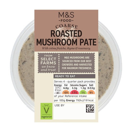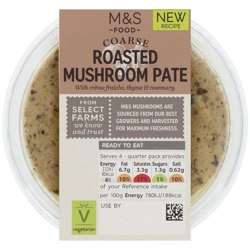 This M&S Coarse Roasted Mushroom Pâté delivers deep, earthy flavours derived from quality ingredients. It is prepared with smooth crème fraîche and cream cheese, providing a rich mouthfeel. This ready-to-eat dip is entirely suitable for vegetarian diets.