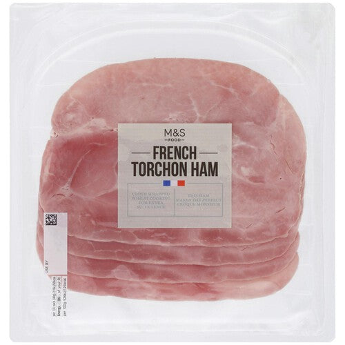This M&S French Torchon Ham is prepared using traditional curing methods. The ham is carefully cooked while encased in a muslin cloth. This specific cooking technique is used to ensure superior texture and extra succulence in every slice.