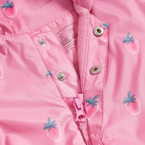 Dress them for rainy-day adventures in this sweet, strawberry print puddlesuit. It's designed with a full-length fastening for easy dressing, with both a zip and poppers for extra protection. The hood features a cosy fleece lining, while elastic cuffs at ankles and wrists shut out draughts and raindrops.