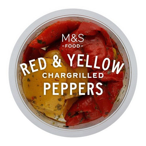 These M&S Marinated Grilled Peppers offer succulent slices of red and yellow peppers prepared using a traditional chargrilling method. They are seasoned with a flavourful dressing that incorporates fresh parsley, basil, and aromatic garlic. As a ready-to-eat item, these antipasti are convenient additions to various meals or platters.