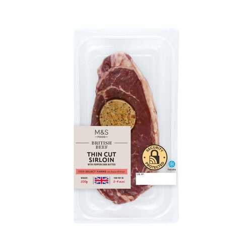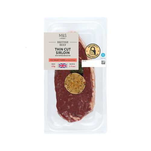 This M&S offering features tender, thin-cut British sirloin steak prepared for convenience. Each portion is complemented by a rich peppercorn butter, adding depth of flavour to the meat.