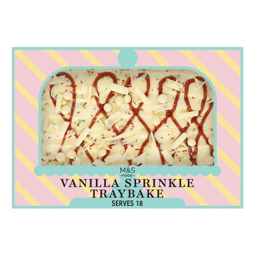 This MS Vanilla Sprinkle Traybake offers a classic sweet treat built upon a soft Madeira sponge base. It is finished with generous swirls of vanilla-flavoured buttercream icing. A drizzle of sweet raspberry jam and colourful edible decorations complete this appealing dessert.