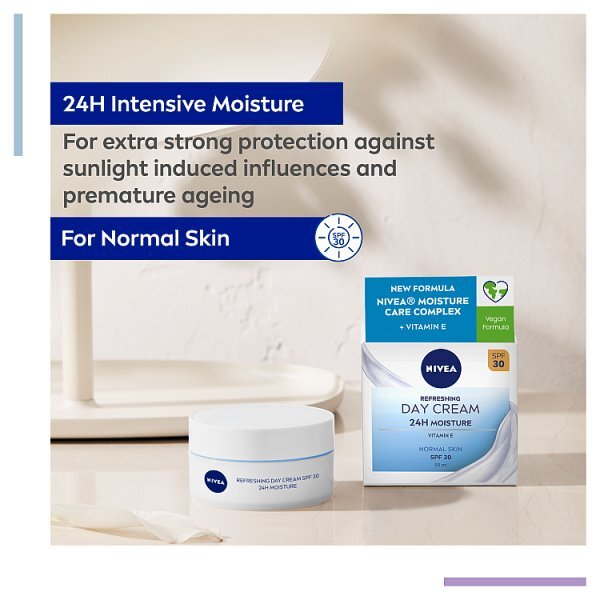 nivea refreshing day cream is a great addition to your daily face care routine it intensively moisturises up to 24 hours thus balancing your skins own moisture level the formula with nivea moisture care complex vitamin e and natural waterlily extract refreshes and plumps your skin with fastabsorbing moisture the cream protects your skin from external stressors and due to spf 30 youre protected against sunlightinduced influences see and feel the difference the lightweight cream melts into the skin effortlessly your skin is deeply moisturised soft and resilient every day the skin compatibility of this refreshing day cream has been dermatologically approved product benefits intensively moisturises up to 24 hours thus balancing skins own moisture level refreshes and plumps your skin with fastabsorbing moisture offers extra strong spf 30 protection against sun light induced influences and premature ageing vegan formula formula free from microplastic