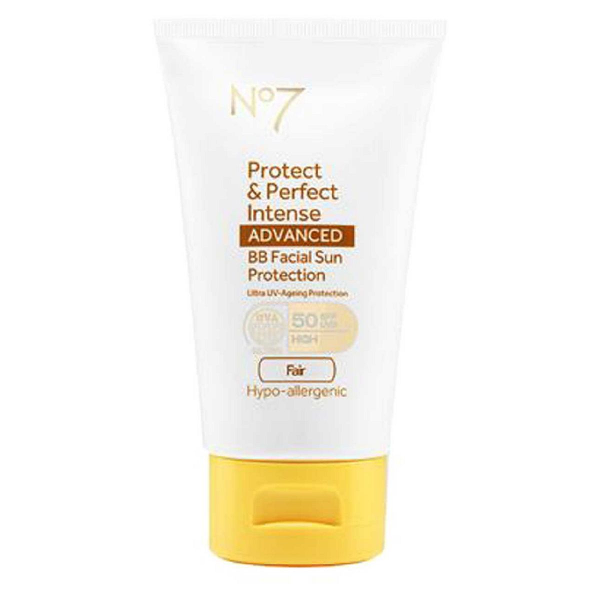 No7 Protect & Perfect Intense ADVANCED BB Gesichtssonnenschutz LSF 50 Hell 50 ml. Unser fortschrittlichster Anti-Aging-Gesichtssonnenschutz kombiniert mit der Technologie unserer klinisch erprobten Protect & Perfect Intense ADVANCED Seren bietet kraftvollen Dreifachschutz vor Sonnenbrand und sorgt für einen gesunden, ebenmäßigen Teint. Der No7 Protect & Perfect Intense BB Gesichtssonnenschutz enthält einen hautaufhellenden Komplex, der den Hautton und die Hautfarbe verbessert und gleichzeitig Pigmentflecken und Hyperpigmentierung vorbeugt.