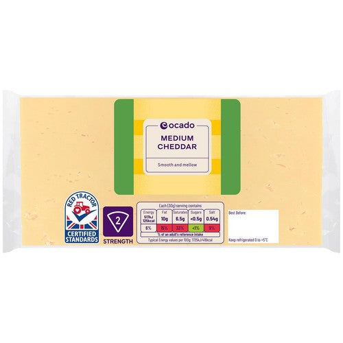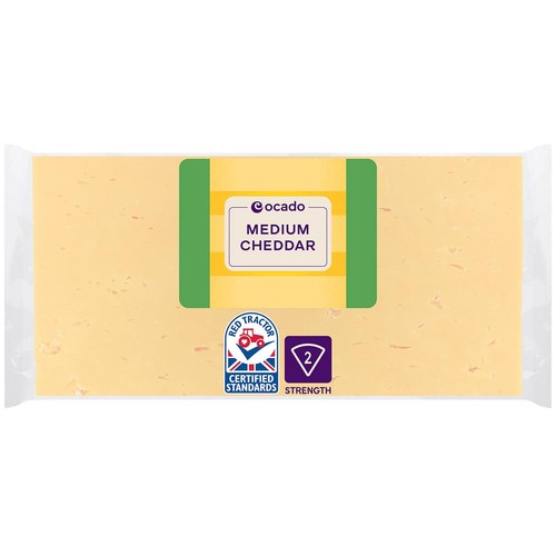 This Ocado Medium Cheddar is produced at an award-winning creamery. It is made using pasteurised milk and achieves a recognised strength rating of 2. This cheese features a firm texture with a satisfyingly smooth and mellow flavour profile suitable for various culinary uses.