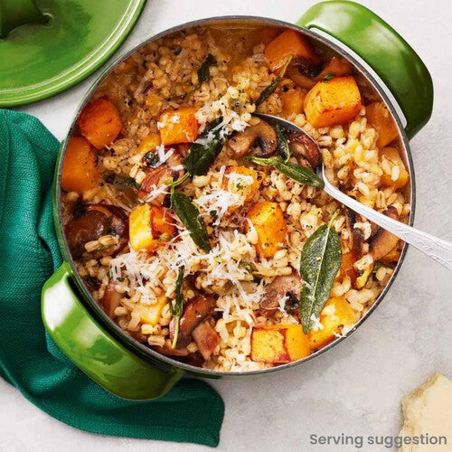If you like what you see in our serving suggestion, scroll down to follow our delicious Mushroom, Butternut and Sage Pearl Barley Risotto recipe.
