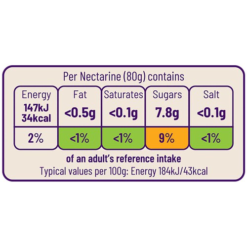 Yellow nectarines are sweet with a touch of tartness, unlike white flesh varieties which are more floral and slightly sweeter. They are tantalisingly juicy and have a smooth, melting texture. As 1 of your 5 a day per 80g serving, they're versatile when it comes to eating and cooking - try them grilled and added to salad or used as a pizza topping in place of pineapple.