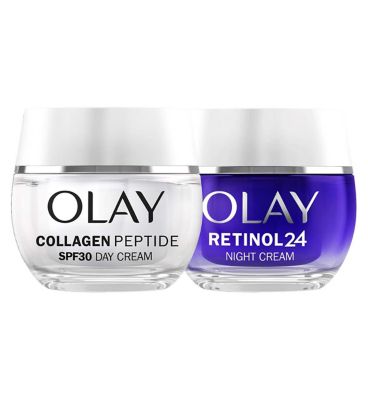 This Olay bundle pairs the potent SPF30 Day Cream with the renewing Retinol 24 Night Cream for comprehensive skincare. The day formula is crafted with Collagen Peptide to specifically target the look of fine lines and wrinkles instantly. Furthermore, 99% pure Niacinamide in the day cream penetrates up to ten layers deep to support surface cell renewal processes. Use the night cream for dedicated overnight skin renewal. This duo forms an effective daily and nightly skincare bundle.