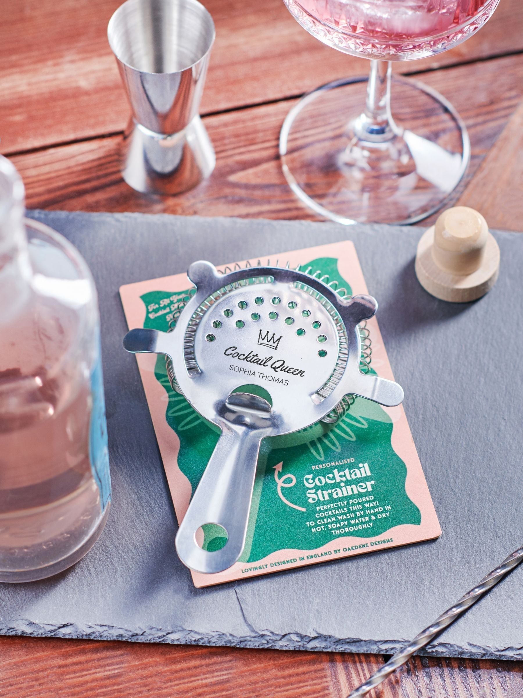 Das perfekte Geschenk für die ultimative Cocktail-Queen! Personalisierbar mit Ihrem Wunschnamen. Diese Cocktailsiebe filtern Fruchtfleisch und Eis mühelos und sorgen für perfekten Cocktailschaum, der Ihre Gäste – oder einfach Sie selbst – begeistern wird!