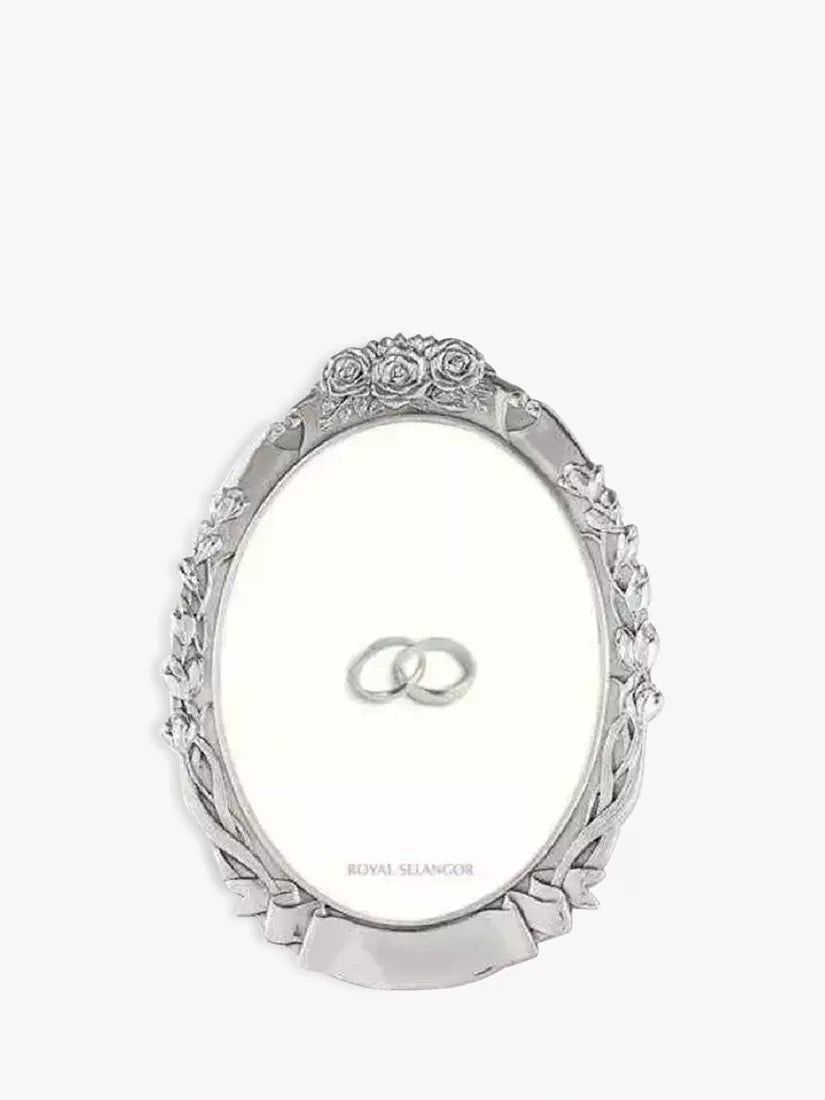Dieser ovale Rahmen ist mit einer wunderschön verzierten Rosenkrone gestaltet und mit Ranken, Bändern und Ritterspornähren verziert, die die Öffnung schmücken.