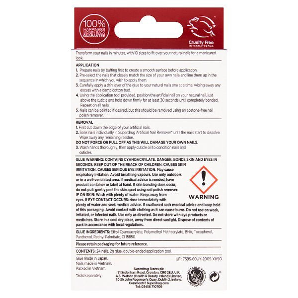glue warning contains cyanoacrylate danger bonds skin in seconds keep out of reach of children causes skin irritaton may cause respiratory irritation avoid breathing fumes and vapours use only outdoors or in wellventilated area if medical advice is needed have product container or label at hand eye irritant bonds skin and eyes instantly if skin bonds do not pull soak in warm water or use nail polish remover and peel gently apart if eye contact occurs rinse immediately with plenty of water and seek medical advice if swallowed seek medical advice and keep hold of this packaging avoid contact with clothing as it can cause burns do not use on weak irritated or infected nails use only as directed do not store with eye products or medicines