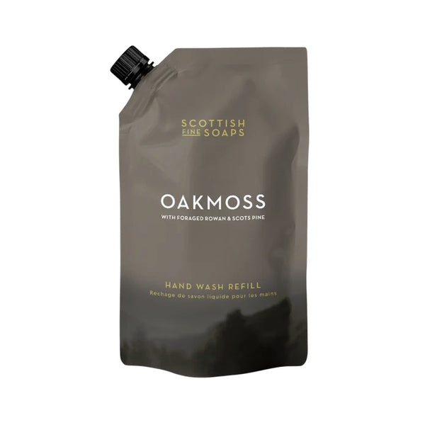 Oakmoss fragrance with woodland notes Nourishes and hydrates your skin Ethically crafted with premium ingredients Vegan-friendly Made in Scotland Immerse yourself in the rich, earthy aroma of Scottish Fine Soaps, infused with the deep, woody fragrance of Oakmoss, complemented by foraged rowan and Scots pine for a truly invigorating scent. This collection brings the essence of Scotland’s ancient woodlands to your self-care routine, wrapping your skin in refreshing hydration and a grounding, natural fragrance. Hand Wash 1.2L Refill Pouch: This hand wash refill contains Scots pine, rowan extract and panthenol to cleanse, hydrate and replenish skin. Whether you are treating yourself or searching for the perfect gift, each piece offers a pampering moment with the signature, long-lasting fragrance. Vegan-friendly and made in Scotland, these products are a perfect addition to any skincare routine. Let the fresh, grounding scent of Oakmoss transport you to Scotland’s lush, misty woodlands.
