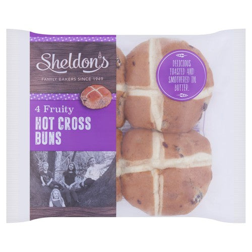Sheldons has been baking for families since 1949, offering traditional hot cross buns. These buns are perfect for toasting and serving generously spread with butter for a satisfying snack. They are a staple item for Easter celebrations or any time of year.
