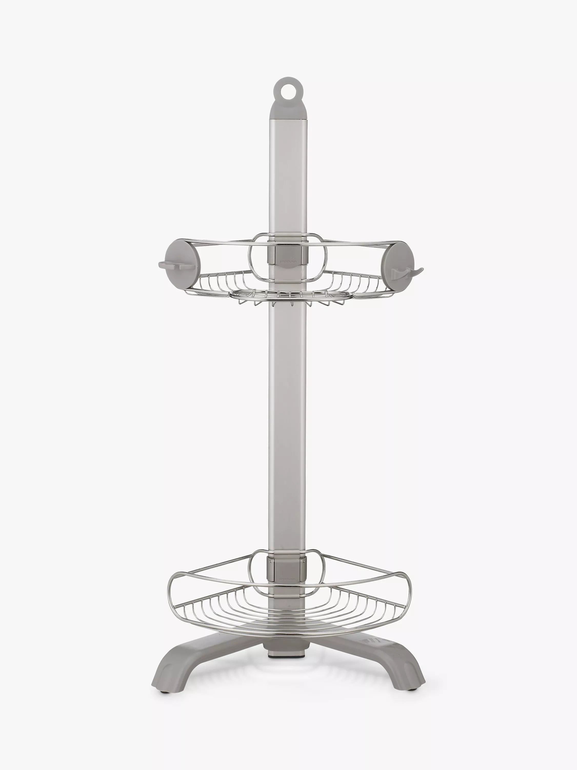 Der simplehuman Eckduschkorb ist verstellbar, um Platz für hohe Flaschen zu schaffen; dazu einfach die Laschen umklappen und die Ablagen nach oben oder unten schieben.