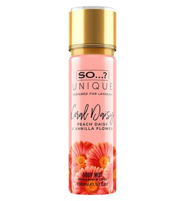 This SO...? UNIQUE Coral Daisy is a 150ml body mist designed for personal fragrance layering. It features a delicate scent profile built around peach daisy and vanilla flower notes. This lighter formulation allows for refreshing use throughout the day or custom scent creation.