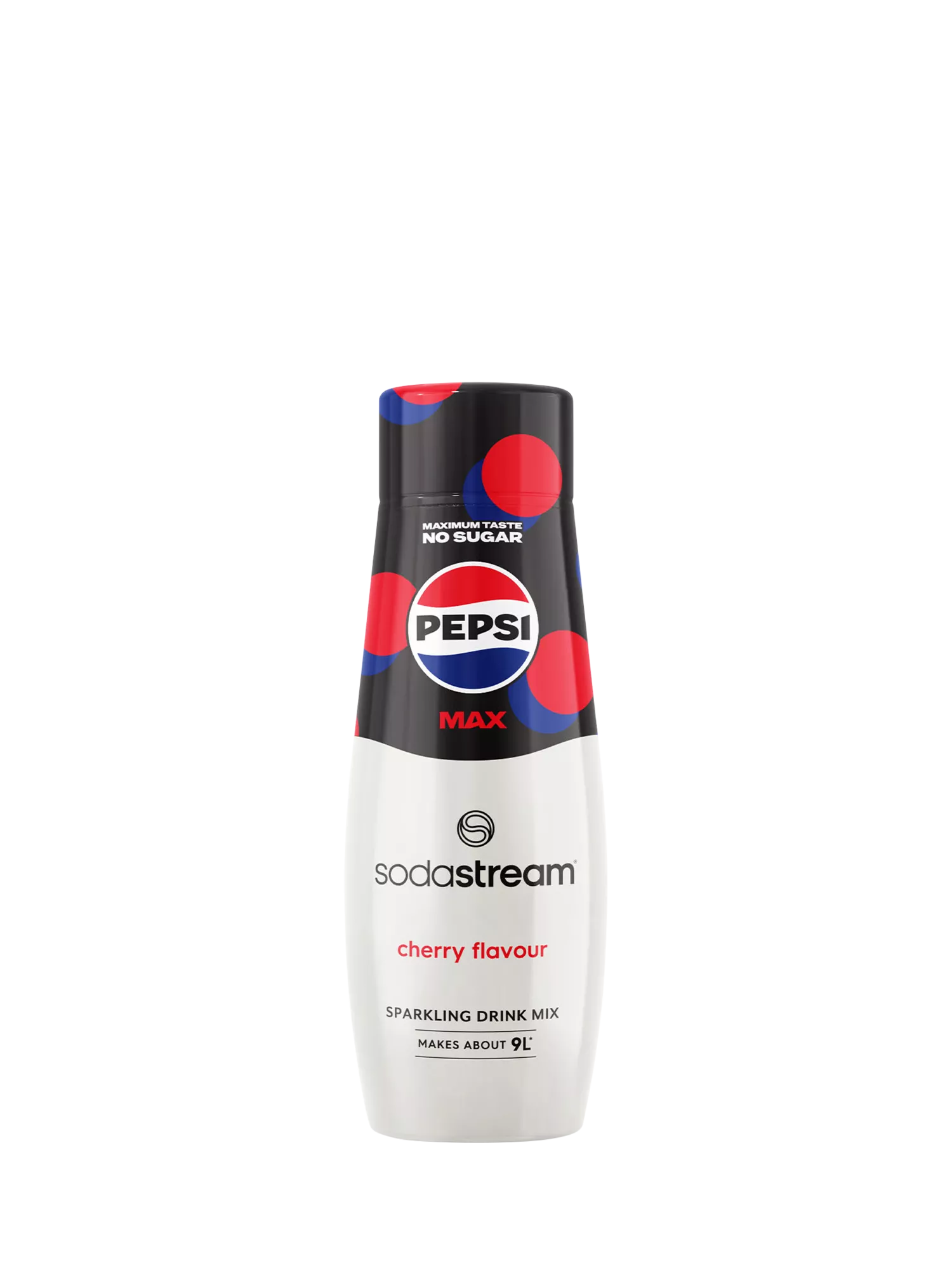 SodaStream Pepsi MAX Cherry ist eine kalorienarme und zuckerfreie Variante des klassischen Pepsi Cherry. Mit Ihrem SodaStream-Sprudelgerät können Sie aus jeder 440-ml-Flasche bis zu neun Liter Pepsi MAX zubereiten – so haben Sie immer reichlich zu trinken und sparen dabei Platz.