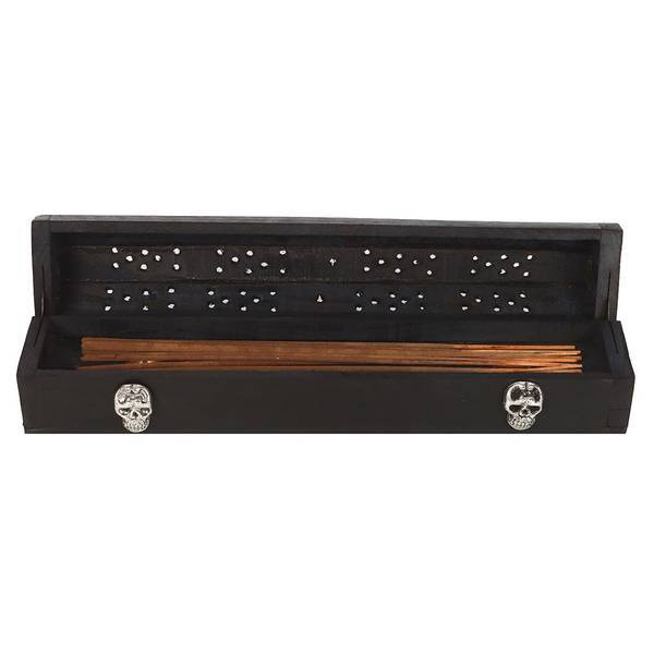 Material: Räucherholz, Duft: Drachenblut, Design: Totenkopf, Breite: 31 cm, Höhe: 65 cm, Inhalt: 10 Räucherstäbchen, 1 Räucherbox, Tiefe: 6 cm, Verpackung: Papier