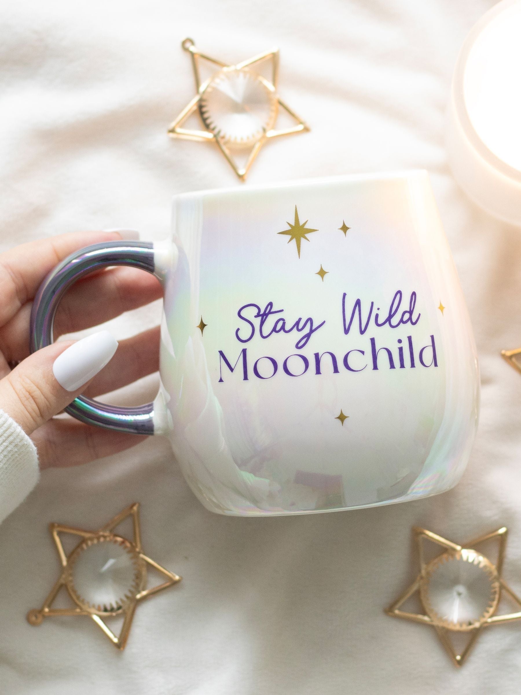 Enhance positive energy with this Stay Wild Moon Child Ceramic Mug. The opalescent glow of the mug is accented with a gold ‘Stay Wild Moon Child’ design and a purple handle. The phrase celebrates being free-spirited and makes an ideal gift for those who embrace their inner wanderer. The rounded shape is ideal for comfortable handling and a generous capacity of 500ml. Microwave safe.