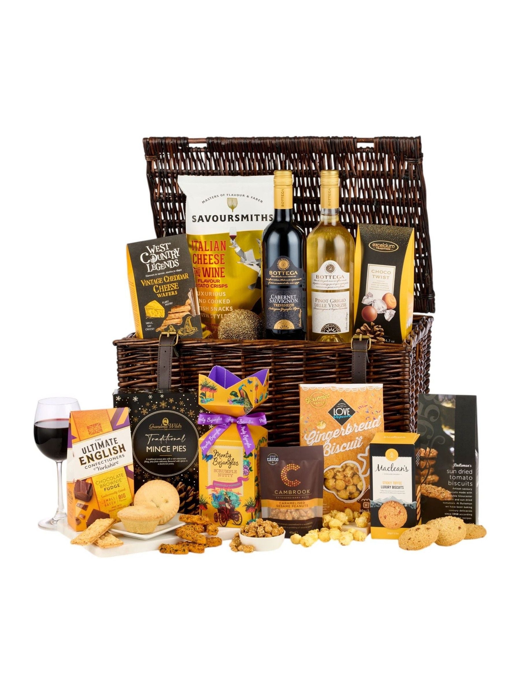Bottega Cabernet Sauvignon 75 cl. Bottega Pinot Grigio 75 cl. Grandma Wilds 4 traditionelle Mince Pies. Love Popcorn Lebkuchen-Popcorn 100 g. Cambrook karamellisierte Sesam-Erdnüsse 45 g. Monty Bojangles Scrumpy Nutty Tip Top Geschenkpackung 150 g. Buiteman sonnengetrocknete Tomatenkekse 75 g. Ultimate English Chocolate Brownie Fudge 150 g. West Country Legends Vintage Cheddar Käsewaffeln 80 g. Macleans Sticky Toffee Luxuskekse 150 g. Savoursmith italienische Käse- und Weinchips 150 g. Excelcium Choco Twist Karamell 120 g. Verpackt in einem dunkelbraunen Korb.