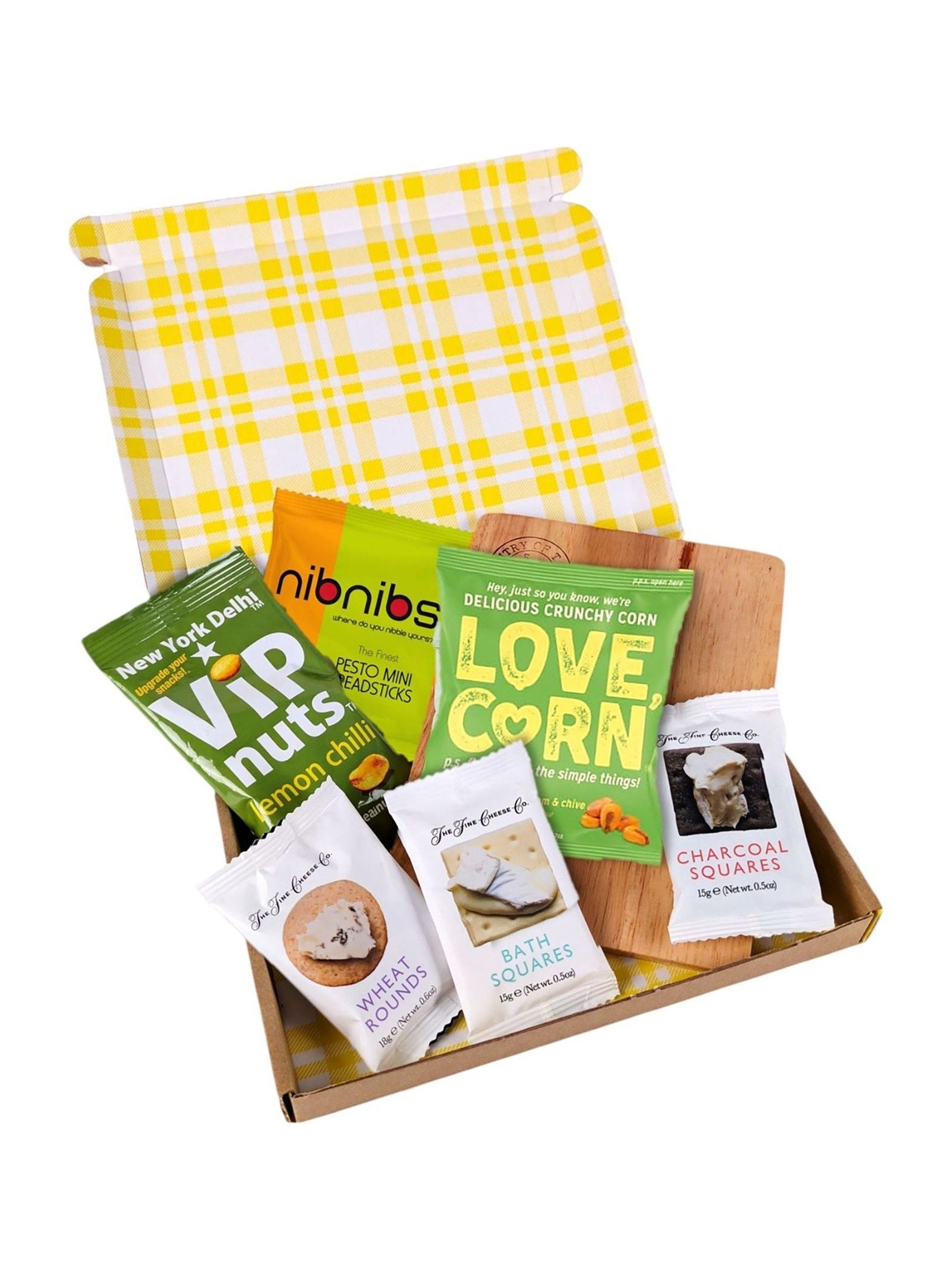 Fine Cheese Co. Holzkohle-Quadrate 15 g x1. Fine Cheese Co. Weizen-Rundkäse 18 g x1. Fine Cheese Co. Badewannen-Quadrate 15 g x1 VIP. Erdnüsse mit Zitrone und Chili 63 g x1. Mais-Sauerrahm-Schnittlauch-Mischung 30 g x1. Mini-Brotstangen mit Pesto 20 g x1. Käsebrett aus Gummibaumholz x1. Lieferung nur innerhalb des britischen Festlands.