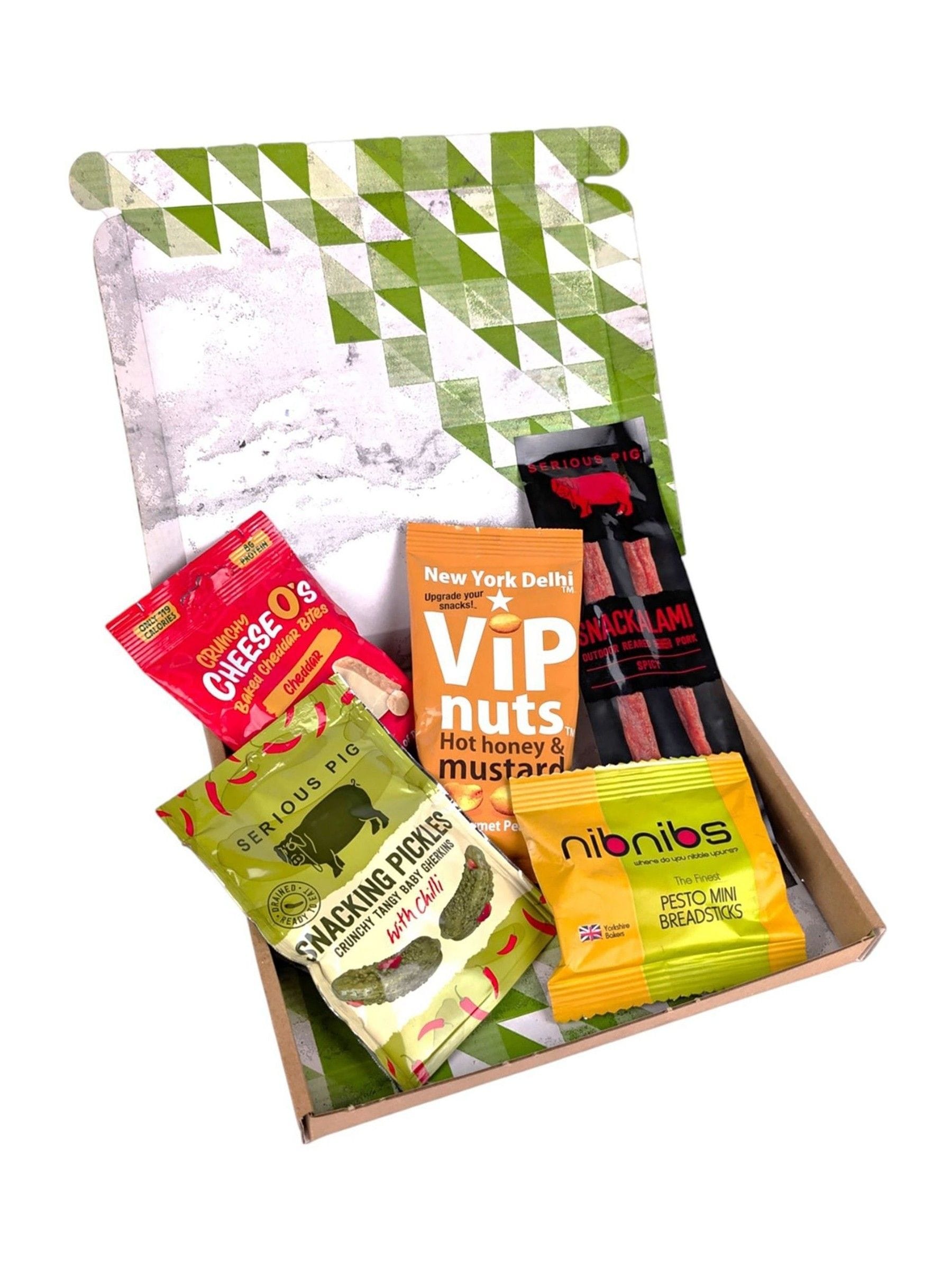 Cheese O's Baked Cheddar Bites 20 g x1. Nibnibs Pesto Mini-Brotstangen 20 g x1. Serious Pig Spicy Snackalami 28 g x1. Serious Pig Snacking Pickles 40 g x1. VIP Nuts Hot Honey & Mustard 63 g x1. Lieferung nur auf dem britischen Festland.