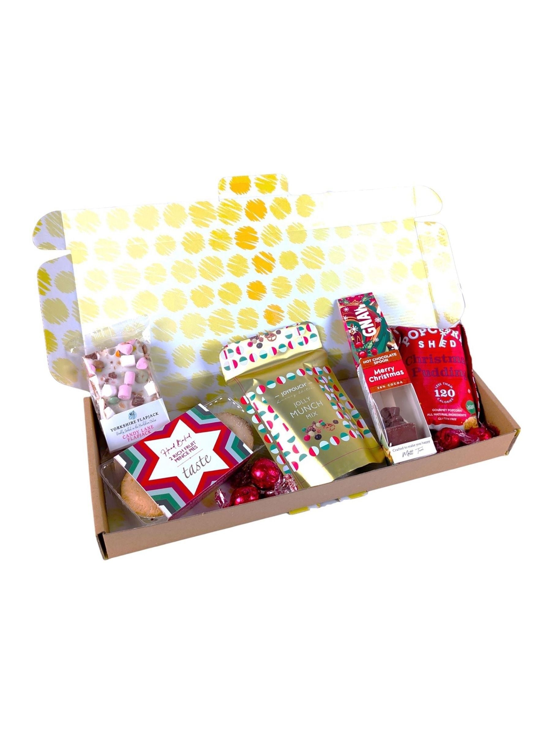 Mince Pies (2 Stück) x1, Popcorn Shed Christmas Pudding Popcorn (24 g) x1, Yorkshire Flapjack Candy Lane Flapjack (90 g) x1, Joypouch Joy Munch Mix (150 g) x1, Lily O'Brien's Milchschokolade (einzeln verpackt, 3 Stück) x3, Gnaw Merry Christmas Hot Choc Spoon (40 g) x1. Lieferung nur auf dem britischen Festland.