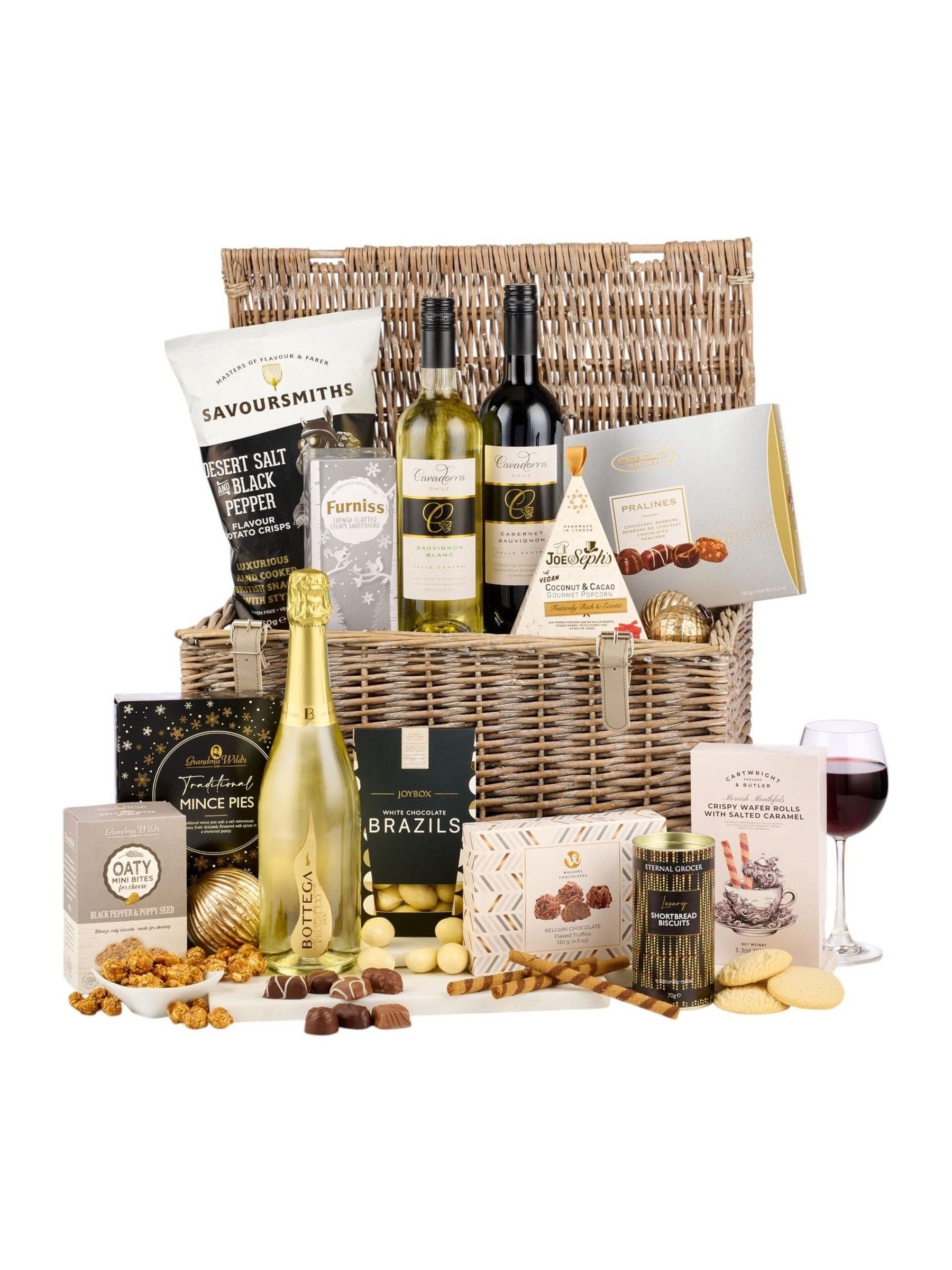 Cavadorra Cabernet Sauvignon 75 cl. Cavadorra Sauvignon Blanc 75 cl. Bottega Prosecco DOC 75 cl. Savoursmith Dessert-Chips mit Salz und schwarzem Pfeffer 150 g. Grandma Wild's Mini-Häppchen mit Pfeffer und Mohn 100 g. Excelcium Pralinen 180 g. Grandma Wild's 4 traditionelle Mince Pies. Walkers Belgische Schokoladentrüffel 130 g. Cartwright & Butler Waffelröllchen mit gesalzenem Karamell 150 g. Furniss Cornish Shortbread mit Clotted Cream 160 g. Joe & Seph's Kokos-Kakao-Popcorn 32 g. Joypots Weiße Schokoladen-Brasilien 100 g. Eternal Grocer Shortbread-Kekse 70 g. Verpackt in einem grauen Weidenkorb.