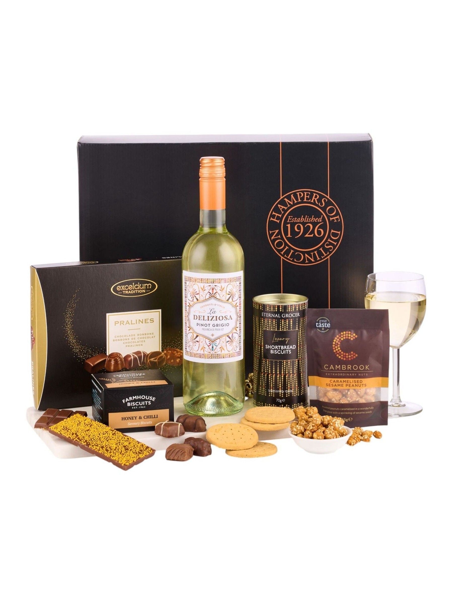 La Deliziosa Pinot Grigio 75 cl. Farmhouse Honig-Chili-Kekse 50 g. Thornton & France Milchschokoladentafel mit Streuseln 40 g. Cambrook Karamellisierte Sesam-Erdnüsse 45 g. Excelcium Pralinen 180 g. Eternal Grocer Shortbread-Kekse 70 g. Verpackt in einer schwarzen Geschenkbox.