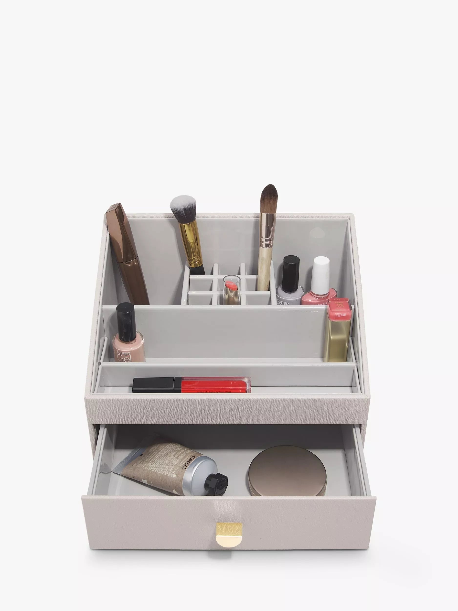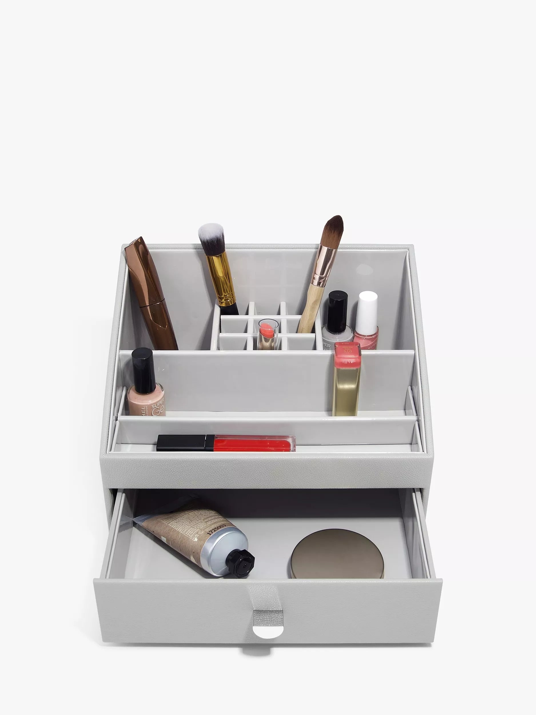 The Stackers Makeup Organiser features an open caddy with multiple compartments to hold all your everyday makeup from brushes to foundation to lipsticks. There is also a pull-out drawer ideal for your larger palettes and makeup items. The lining can be wiped clean and the organiser has been designed to fit with the Makeup Drawer allowing you to add additional drawers if and when your collection grows.