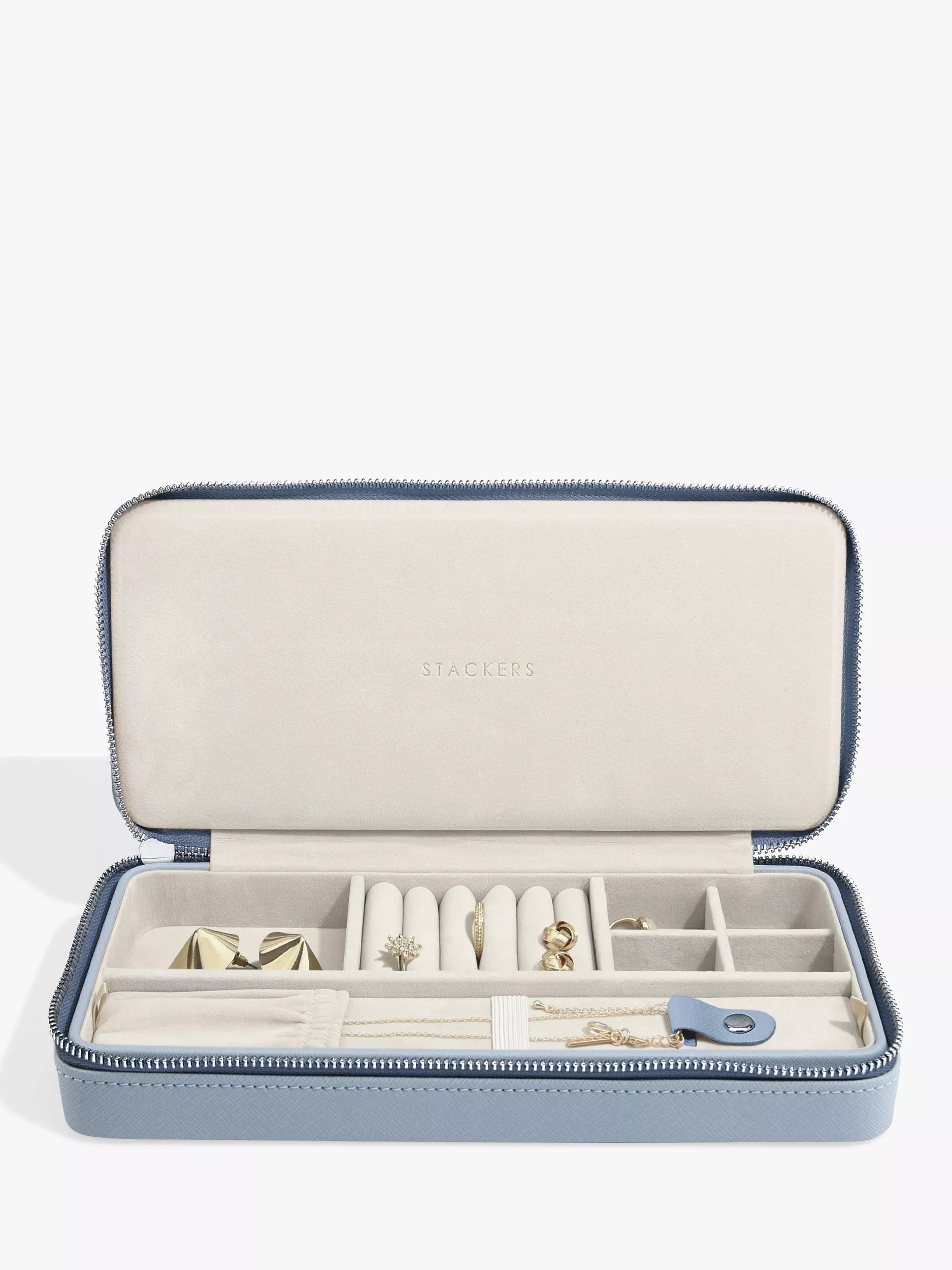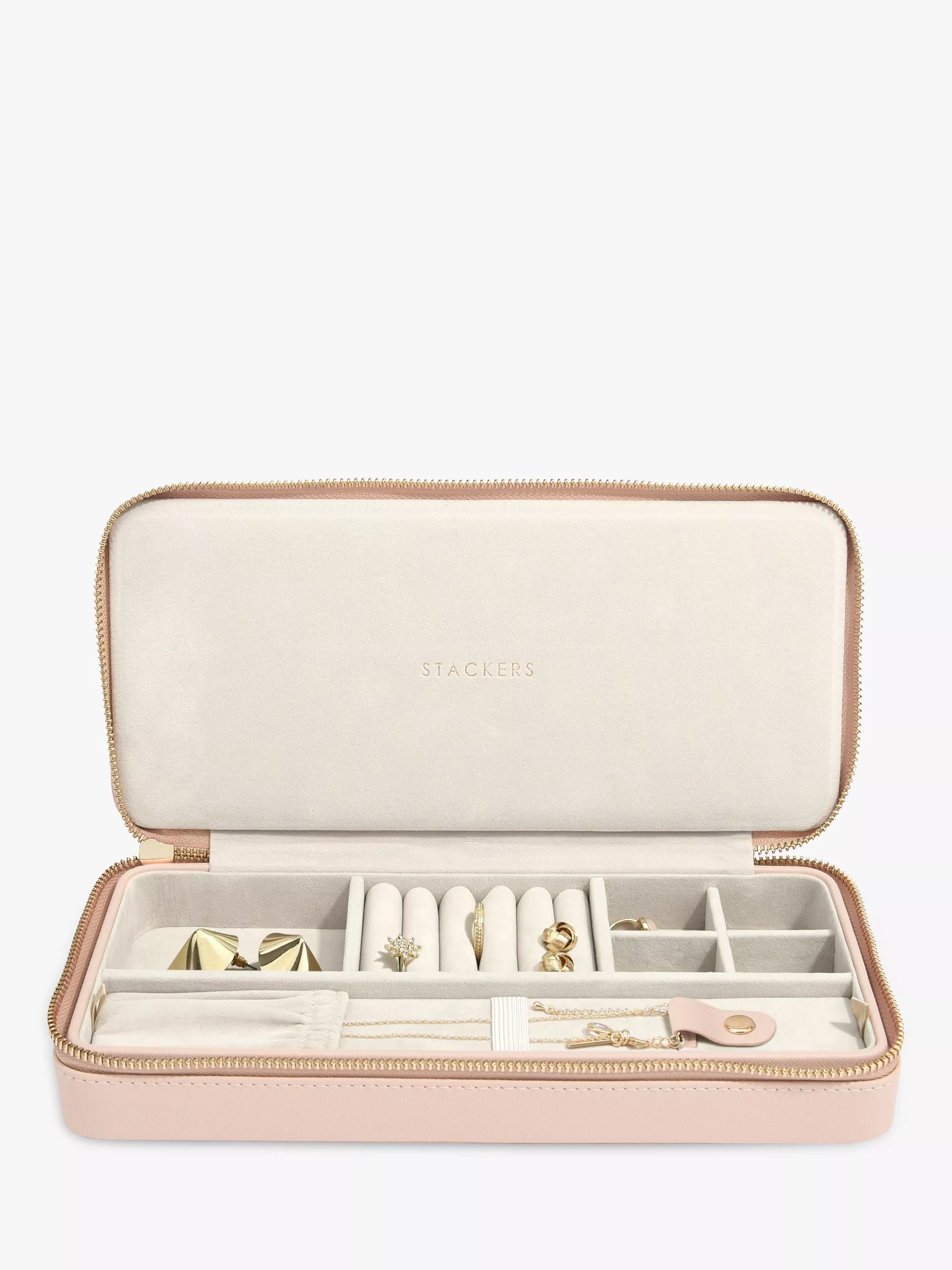 Diese wunderschöne Reisebox von Stackers für Halsketten verfügt über 7 verschiedene Fächer und einen herausnehmbaren Einsatz zur Aufbewahrung von Halsketten.