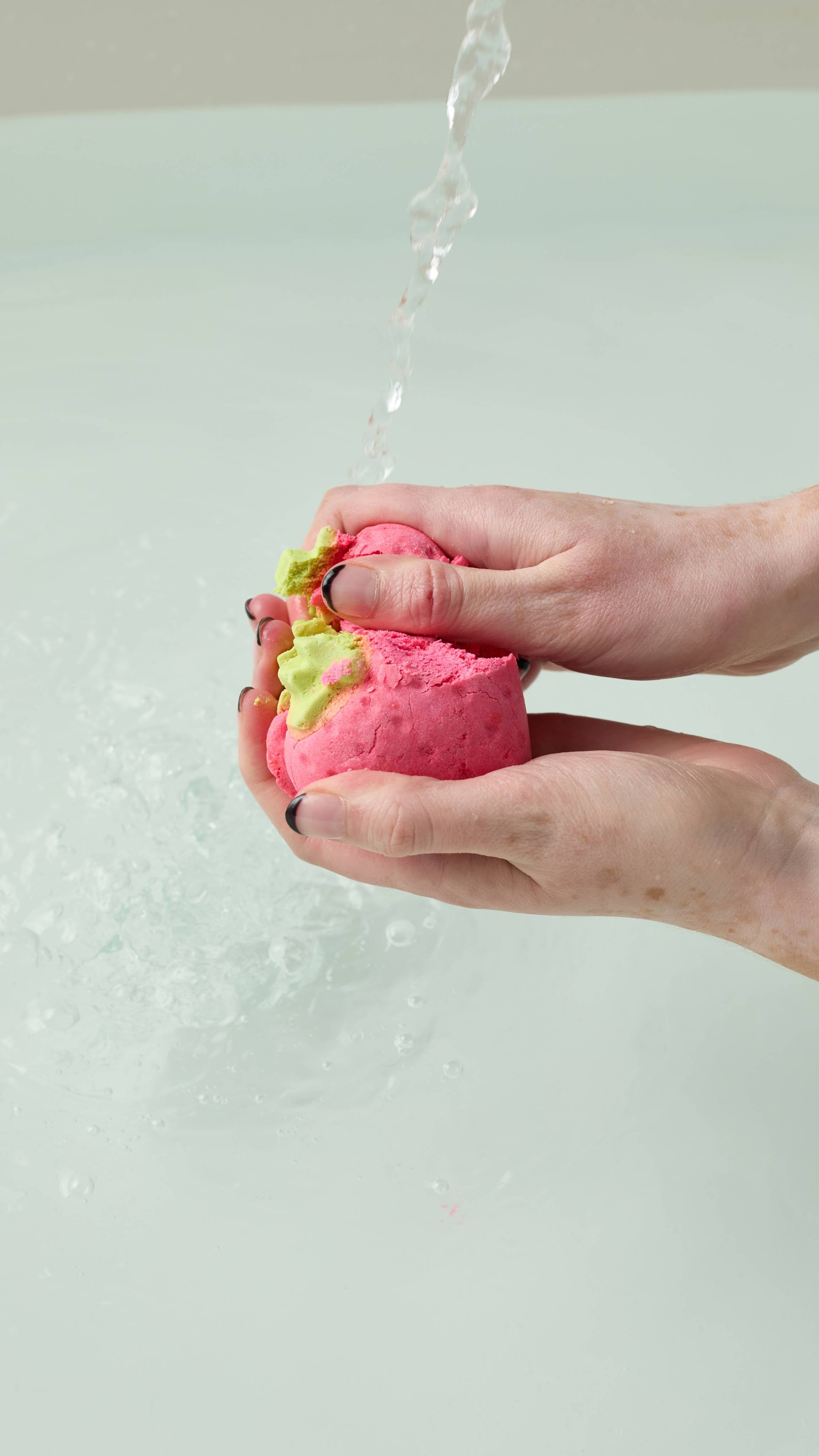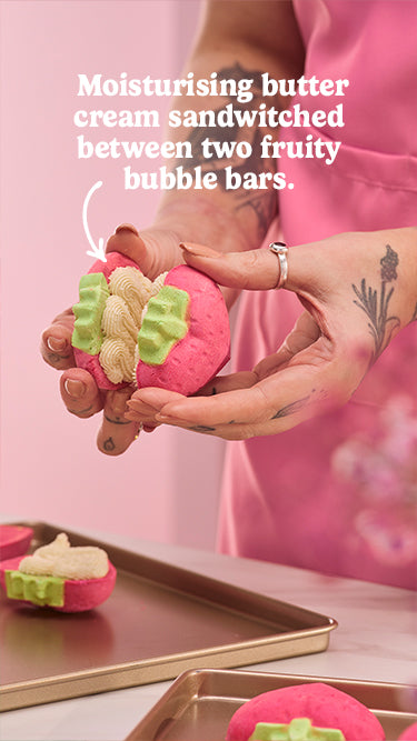 - Zwei Hälften eines fruchtigen Schaumbads sind mit einer feuchtigkeitsspendenden Buttercreme umhüllt – perfekt, um Ihrer Haut Geschmeidigkeit zu verleihen.