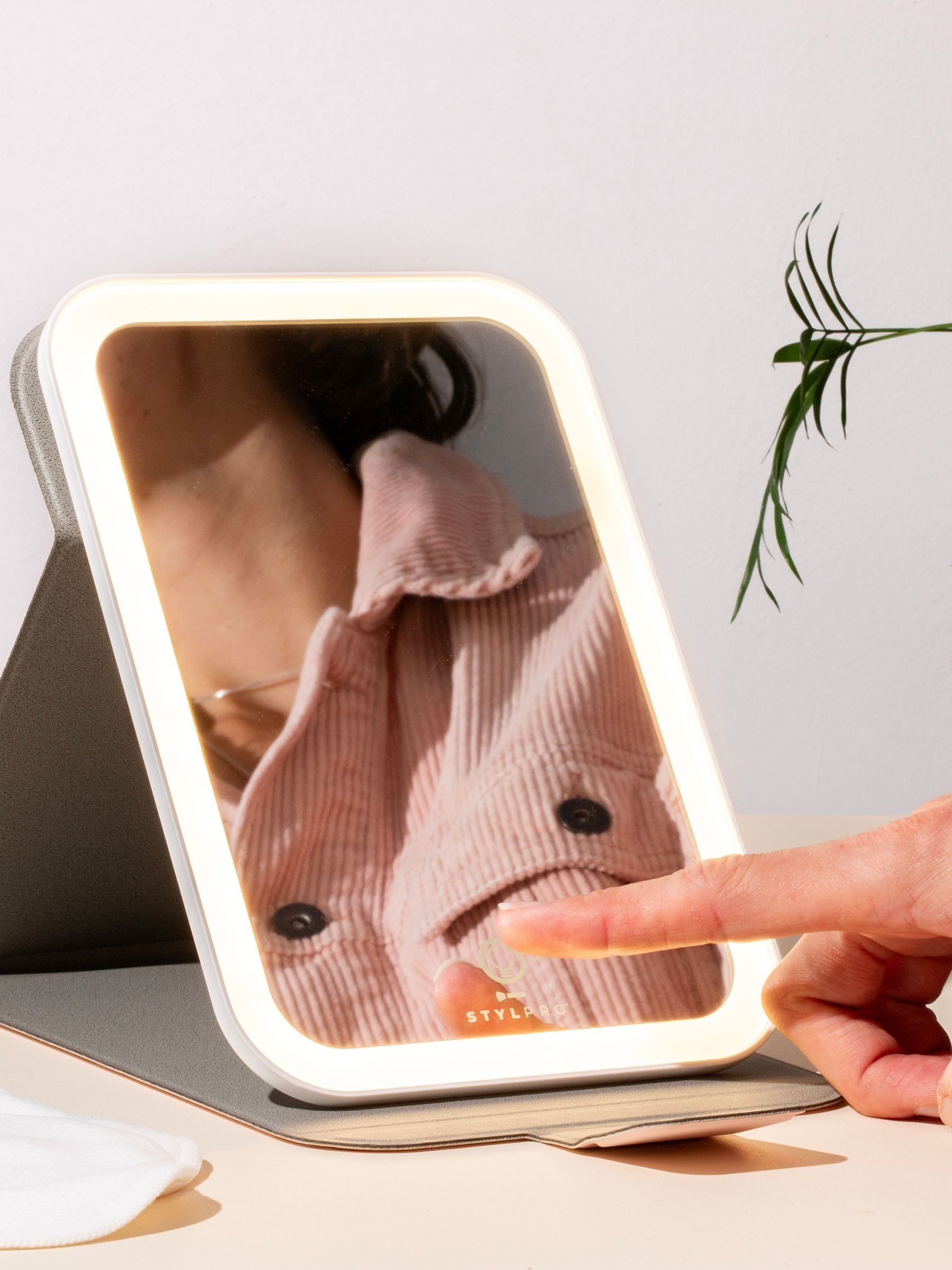Der STYLPRO On Tour Reisespiegel ist ein leichter, schlanker und tragbarer Spiegel mit dimmbaren LED-Lichtpaneelen für die perfekte Ausleuchtung beim Schminken. Strahlend schön, leicht unterwegs: Mit dem STYLPRO On Tour Petite Reisespiegel wird jedes Auffrischen zum glamourösen Erlebnis. Fertigmachen unterwegs muss nicht kompliziert sein; unser praktischer Reisespiegel macht es Ihnen kinderleicht. Dieser tragbare, leichte Reisespiegel verfügt über eine flach zusammenklappbare Schutzhülle, die gleichzeitig als vertikaler oder horizontaler Ständer dient, und ist mit integrierten LED-Leuchten ausgestattet, sodass Sie zu jeder Tageszeit genau sehen, was Sie tun. Wählen Sie aus 3 dimmbaren Lichteinstellungen (einfach gedrückt halten) – hell, warm und kalt – die Sie mit wenigen Fingertipps wechseln können. Und das Beste: Der Spiegel ist per Micro-USB aufladbar (Kabel im Lieferumfang enthalten), sodass Sie sich keine Gedanken über Batterien machen müssen.
