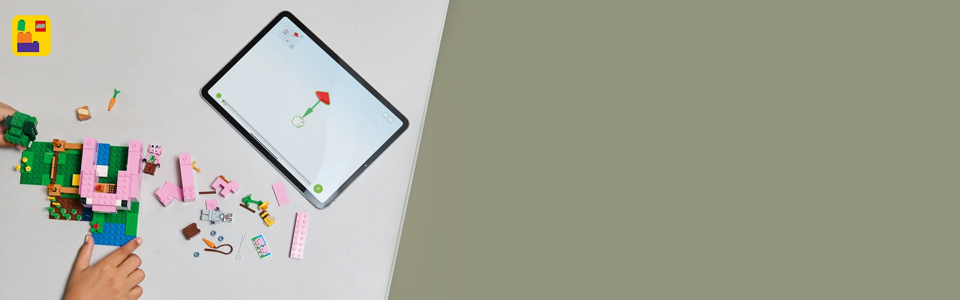 Dieses kreative Hausbauset im Minecraft-Waldbiom enthält viele Figuren aus dem beliebten Videospiel: einen Helden im Wolfsfell, ein Ferkel, eine Biene, ein ausgewachsenes Schwein und ein zombifiziertes Piglin. Kinder können Aktionen aus dem Spiel nachspielen, zum Beispiel das ausgewachsene Schwein satteln und ihm eine Karotte vor die Nase halten, um es durch das schweineförmige Haus und den Garten zu reiten. Es gibt ein Ackerfeld mit Kartoffeln und Rüben zum Anpflanzen und ein Feld mit einem Tor, durch das das Ferkel geleitet werden kann. Dem zombifizierten Piglin, der den Spaß verderben will, können Kinder ausweichen, indem sie ins Haus gehen. Dort gibt es ein Bett, ein Bücherregal und eine Werkbank, die die Fantasie anregen. Mit der LEGO® Builder App können Kinder die Modelle in 3D vergrößern und drehen.