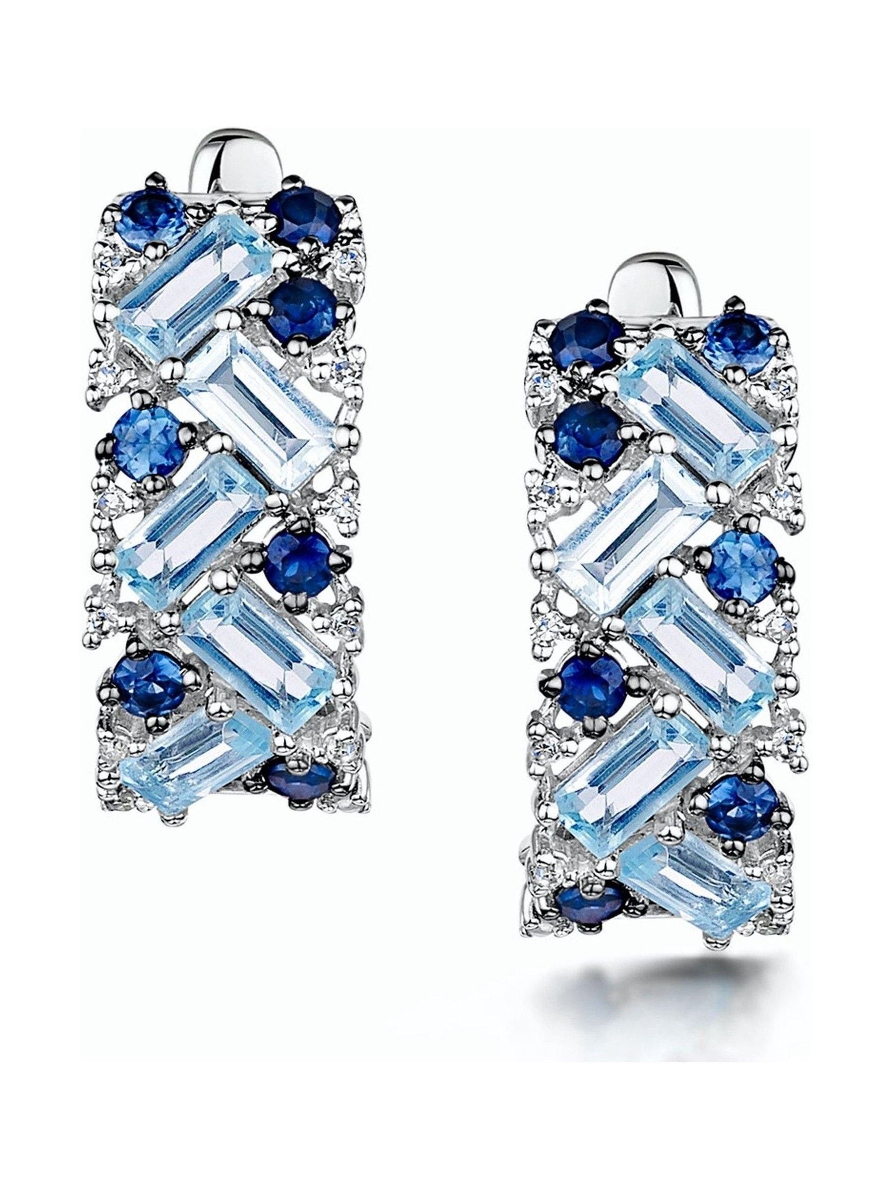 Ein wahrhaft atemberaubendes und einzigartiges Paar Creolen mit runden blauen Saphiren und baguettegeschliffenen blauen Topasen.