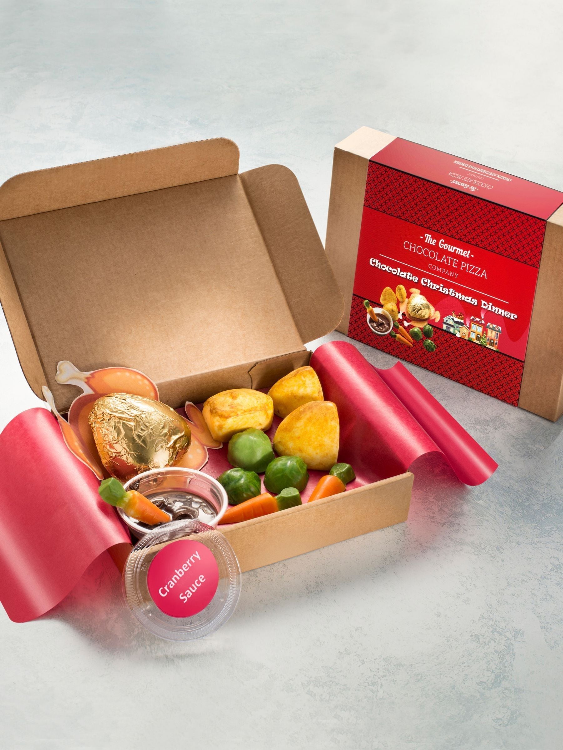 Ihr Weihnachtsessen könnte nicht besser sein! Genießen Sie ein festliches Menü mit allem Drum und Dran, darunter ein Truthahn aus Milchschokolade, Karotten und Rosenkohl aus Milchschokolade sowie Bratkartoffeln mit weißer Schokolade. Und natürlich die Preiselbeersauce (mit Himbeergeschmack) zum Dippen der Karotten oder sogar des Truthahns! Seien Sie der Star am Weihnachtstisch und lassen Sie sich von Ihrem Schokoladenbraten verzaubern. Man sagt ja, an Weihnachten kann man Schokolade zum Frühstück essen – jetzt können Sie sie auch zum Mittagessen genießen!
