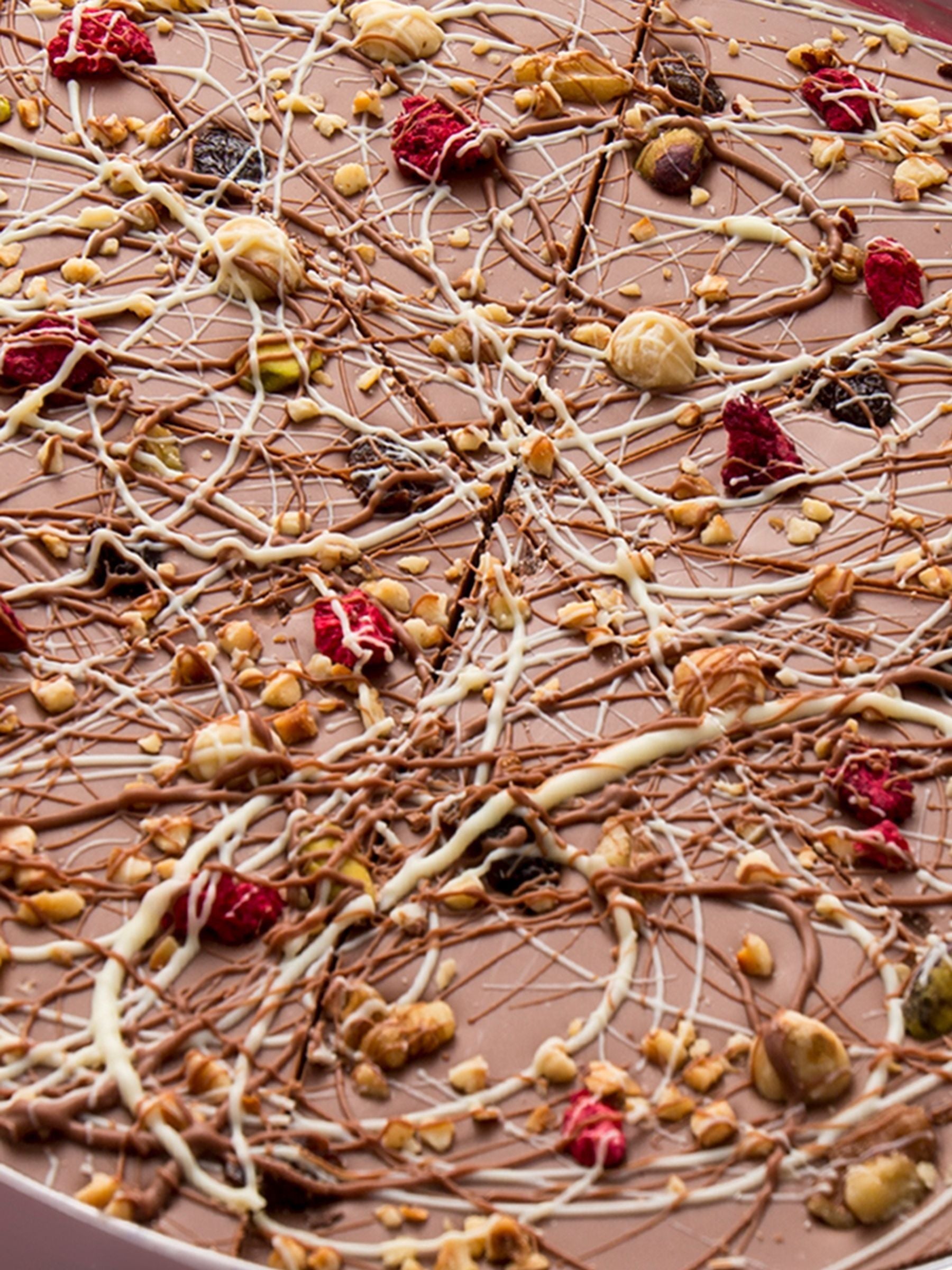 Wer Schokolade mit Früchten und Nüssen liebt, wird diese Schokoladenpizza lieben. Zartschmelzende belgische Milchschokolade, großzügig bestreut mit einer köstlichen Auswahl an gefriergetrockneten Himbeeren, Rosinen, ganzen und gewürfelten gerösteten Haselnüssen und zum Schluss mit Milch- und weißer Schokolade beträufelt. In 8 Stücke geschnitten – fertig zum Genießen!