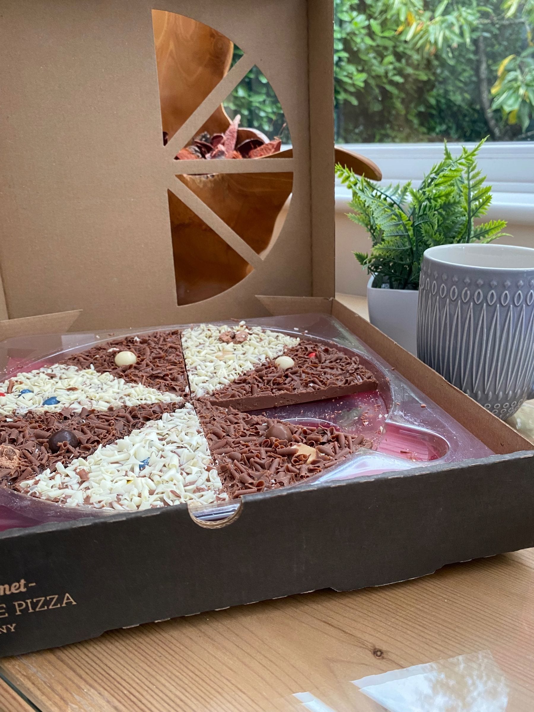 Eine unserer beliebtesten Schokoladenpizzen: Acht Stücke aus sechs unserer beliebtesten Pizzasorten. Belgische Vollmilch- und Zartbitterschokolade mit einer Auswahl an Premium-Toppings – von Vanille-Fudge über schokoladenüberzogene Reisbällchen bis hin zu Orangen-Schokolade und vielem mehr. Hier ist für jeden Geschmack etwas dabei. In mundgerechte Stücke geschnitten: je zwei Stücke von drei Sorten und je ein Stück von zwei weiteren. Die Qual der Wahl: Welches Stück soll man zuerst probieren? Tauchen Sie ein in dieses Paradies belgischer Schokolade – und dann stellt sich die Frage: Teilen oder nicht teilen?