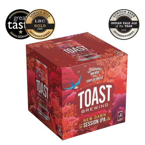 Toast Brewing New Dawn SIPA is a distinguished Great Taste Award winner known for its hop-forward character. This session IPA delivers bold citrus notes perfectly balanced by a subtly floral and uplifting profile. It is uniquely crafted using surplus bread alongside premium malted barley and American hops.