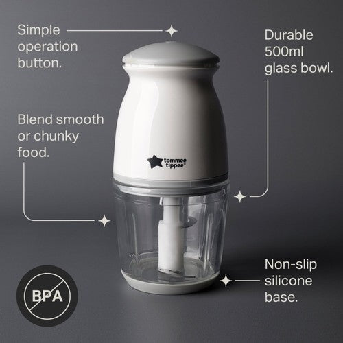 Simplify the weaning journey with the Tommee Tippee Baby Food Blender, essential for homemade infant nutrition. This appliance handles everything from initial smooth vegetable or fruit purées and fine cereal grinding to chunkier meals. It is designed for straightforward, single-touch operation during your baby's feeding stages.