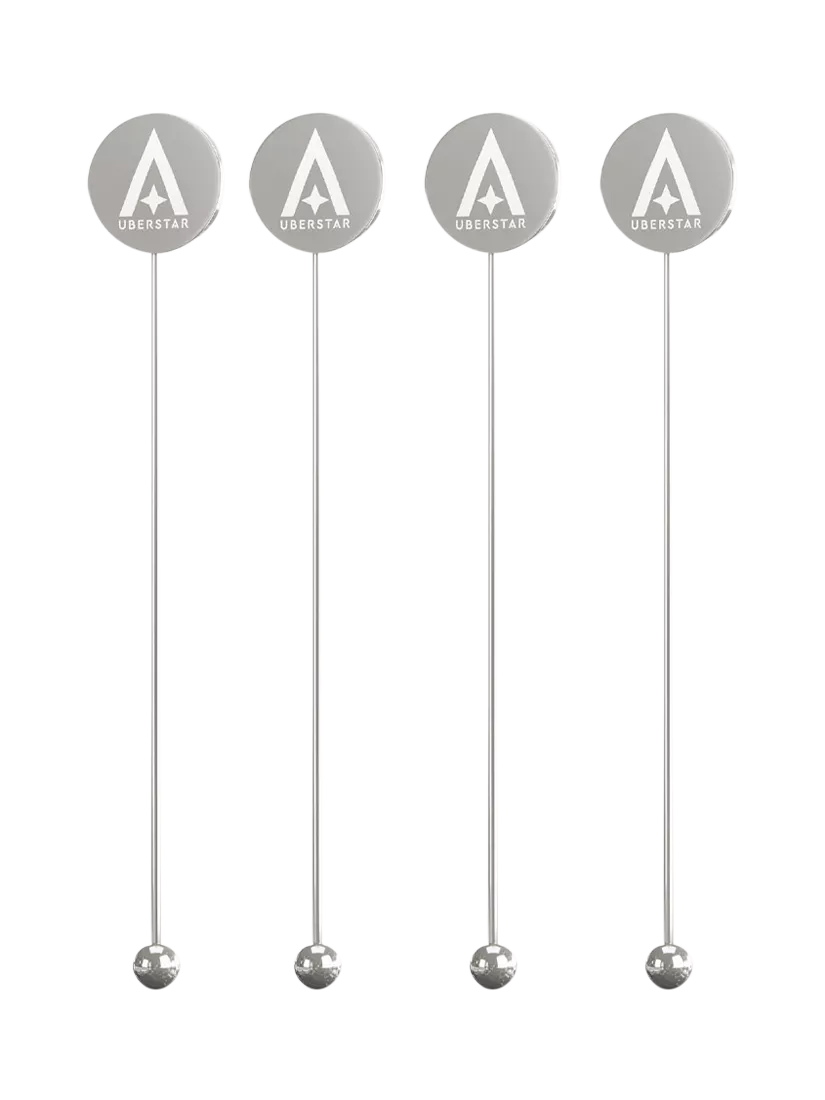 Vier elegante und stilvolle Rührstäbchen mit luxuriöser Silberoberfläche, hergestellt aus hochwertigem Edelstahl für eine lange Lebensdauer.