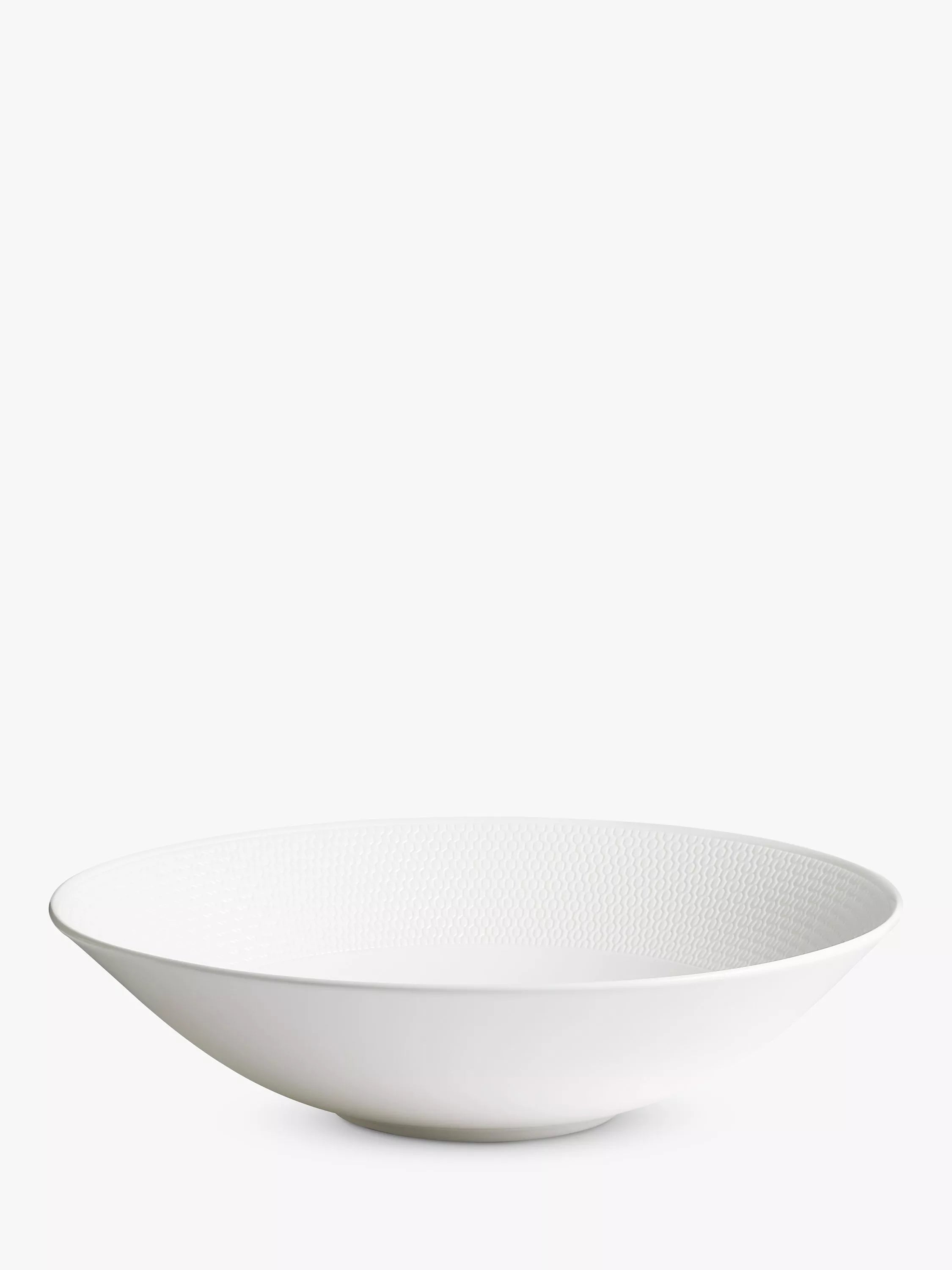 Große Servierschüssel aus der Wedgwood Gio Kollektion, gefertigt aus elegantem, weißem Fine Bone China. Jedes Stück besticht durch eine sorgfältig gestaltete Intaglio-Textur, bei der das Design in die Oberfläche eingelassen ist. Das Geschirr ist modern und elegant, mikrowellen- und spülmaschinenfest, Handwäsche wird jedoch empfohlen. Es lässt sich ideal mit anderen Wedgwood Kollektionen kombinieren.