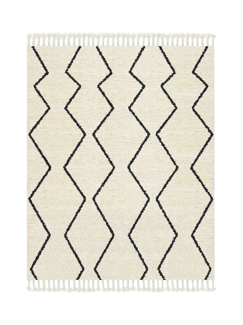 Unser flauschiger Souk-Teppich, ein absoluter Bestseller, ist handgewebt aus 100% Wolle und mit handgeflochtenen Quasten verziert.