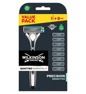 The Wilkinson Sword Quattro Essential 4 Precision Sensitive Razor is engineered for a close and comfortable shaving experience, ideal for those needing extra care. This system features four titanium-coated blades to ensure a smooth glide across the skin surface. It comes complete with a handle and blade refills for extended use.