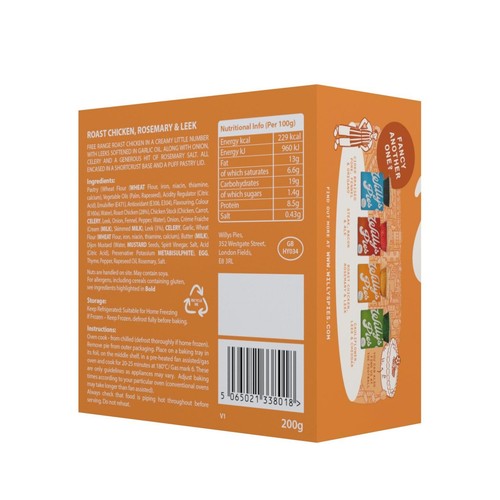 Willys Pies crafts this individual savoury bake featuring tender, free-range roast chicken. The creamy filling includes leeks softened in garlic oil, complemented by onion, celery, and rosemary salt. This satisfying combination is encased in a traditional shortcrust base and topped with a light, flaky puff pastry lid.