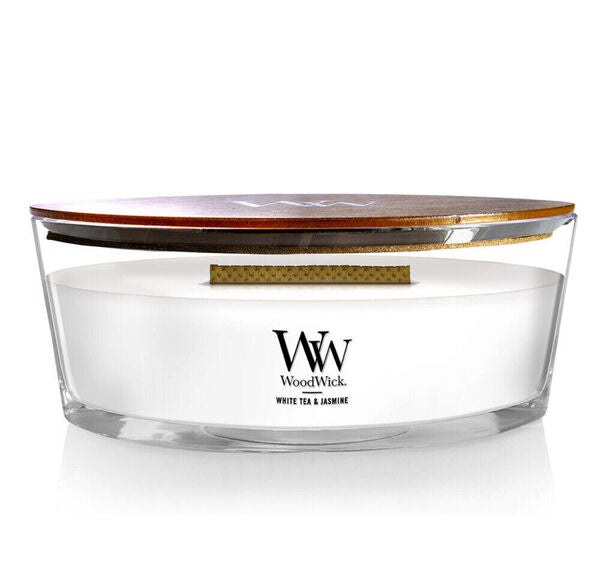 Die Woodwick Ellipse Duftkerze in der Duftrichtung Weißer Tee Jasmin (16 oz) vereint den zarten Blumenduft von Jasmin mit der beruhigenden Essenz von Weißem Tee und kreiert so einen wohltuenden, eleganten Duft, der Ihren Raum mit Ruhe erfüllt.
